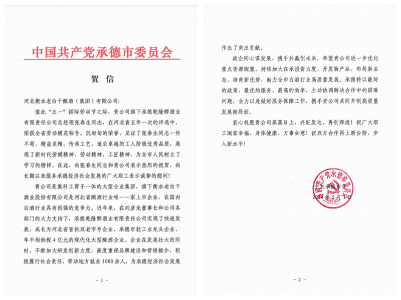 河北衡水老白干釀酒集團(tuán)收到一封來自承德市委的賀信,賀信主要內(nèi)容是對(duì)河北衡水老白干釀酒集團(tuán)子公司承德乾隆醉酒業(yè)(板城酒業(yè))黨委書記、總經(jīng)理張春生榮獲“全省勞動(dòng)模范”稱號(hào)表示祝賀。祝賀信中講到:“張春生同志一絲不茍、精益求精,傳承工藝、追求卓越的工人階級(jí)優(yōu)秀品質(zhì),展現(xiàn)了新時(shí)代勞模精神、勞動(dòng)精神、工匠精神,為全市人民樹立了榜樣,近年來,企業(yè)在發(fā)展壯大的同時(shí),不斷加大研發(fā)創(chuàng)新力度,高度重視品牌建設(shè)和營銷推介,積極履行社會(huì)責(zé)任,帶動(dòng)地方就業(yè)1000余人,為承德經(jīng)濟(jì)社會(huì)發(fā)展作出了突出貢獻(xiàn)。”張春生作為制造業(yè)(工業(yè)領(lǐng)域)的翹楚,先后獲省“三三三人才工程”人選、河北省企業(yè)家協(xié)會(huì)先進(jìn)工作者、河北省食品行業(yè)年度人物、中國商業(yè)聯(lián)合會(huì)科學(xué)技術(shù)獎(jiǎng)、全國商業(yè)科技進(jìn)步獎(jiǎng)-特等獎(jiǎng)、2020年與2022年度分別榮獲河北省優(yōu)秀民營企業(yè)家等多項(xiàng)榮譽(yù)。