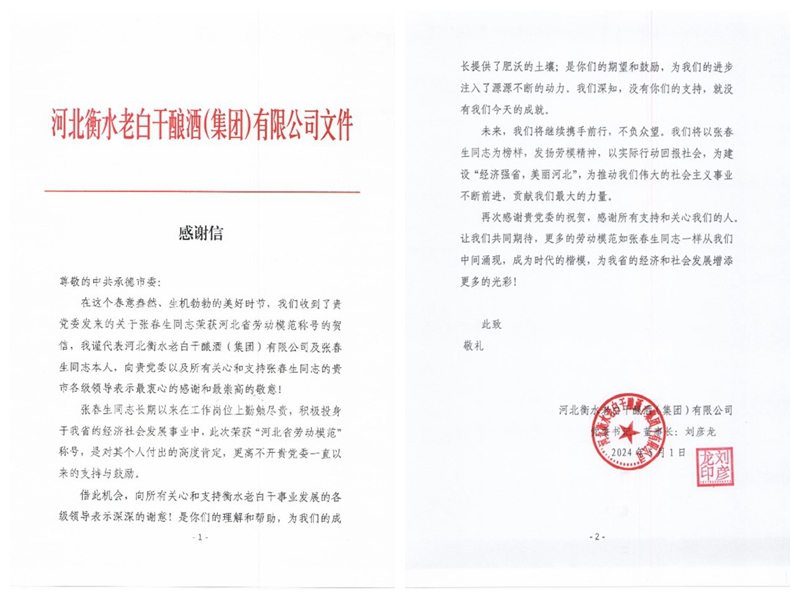 河北老白干釀酒集團(tuán)在感謝信中寫到:“張春生同志長期以來在工作崗位上勤勉盡責(zé),積極投身于我省的經(jīng)濟(jì)社會(huì)發(fā)展事業(yè)之中,此次榮獲河北省勞動(dòng)模范,是對(duì)其個(gè)人付出的高度肯定,更離不開承德市黨委一直以來的支持與鼓勵(lì)。我們將以張春生同志為榜樣,發(fā)揚(yáng)勞模精神,以實(shí)際行動(dòng)回報(bào)社會(huì),為建設(shè)經(jīng)濟(jì)強(qiáng)省,美麗河北,貢獻(xiàn)我們最大的力量”。